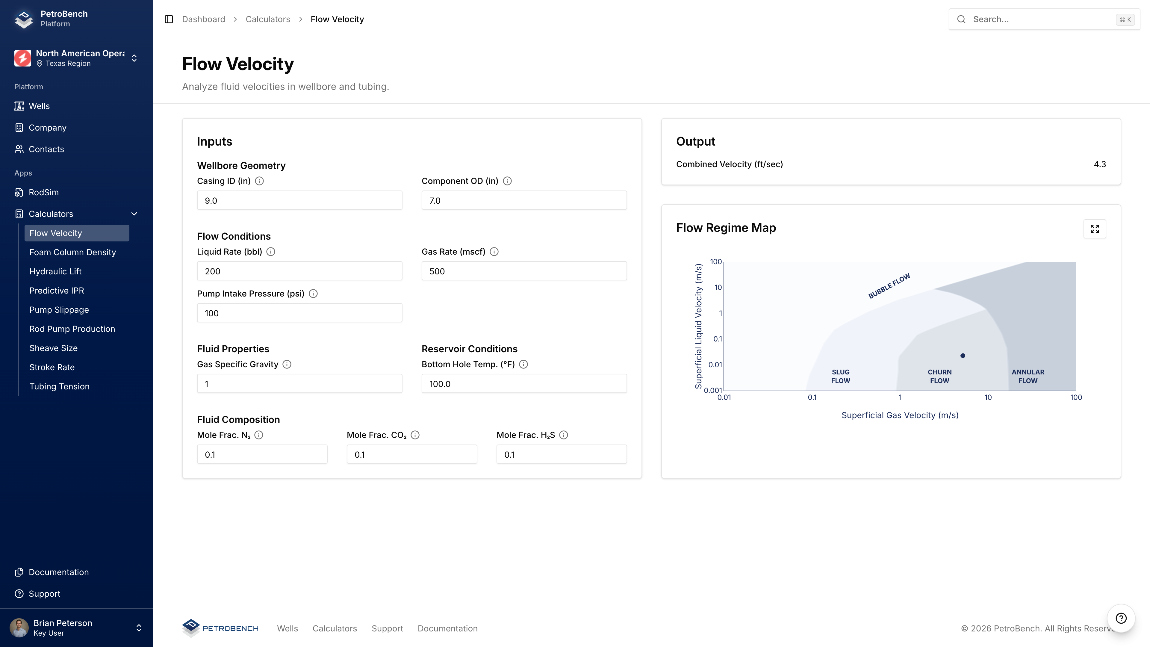 The Flow Velocity calculator analyzes fluid velocities in the tubing-casing annulus and determines the flow regime based on gas and liquid rates.