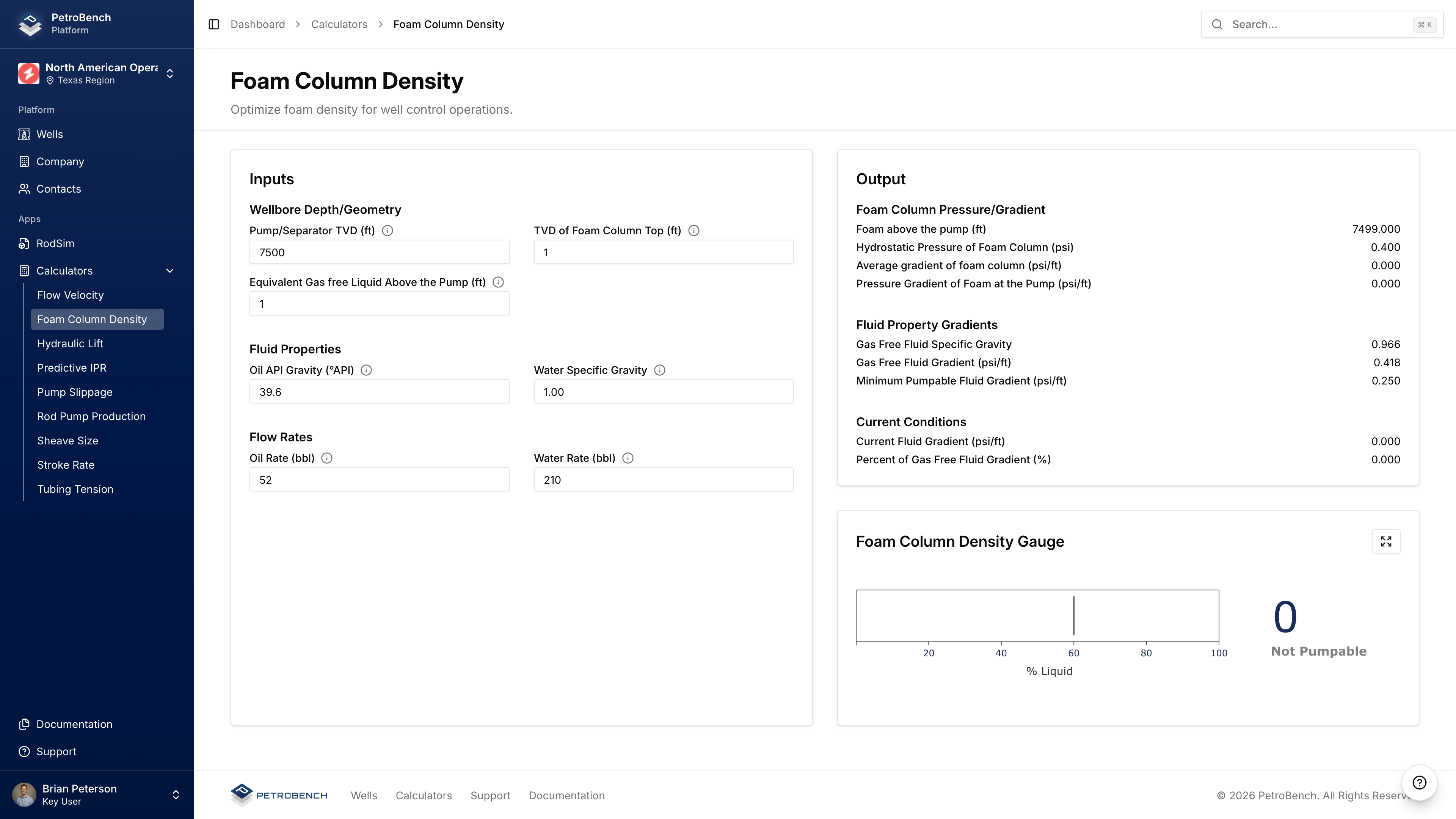 The Foam Column Density calculator evaluates foam accumulation above the pump and determines if conditions allow effective pumping.