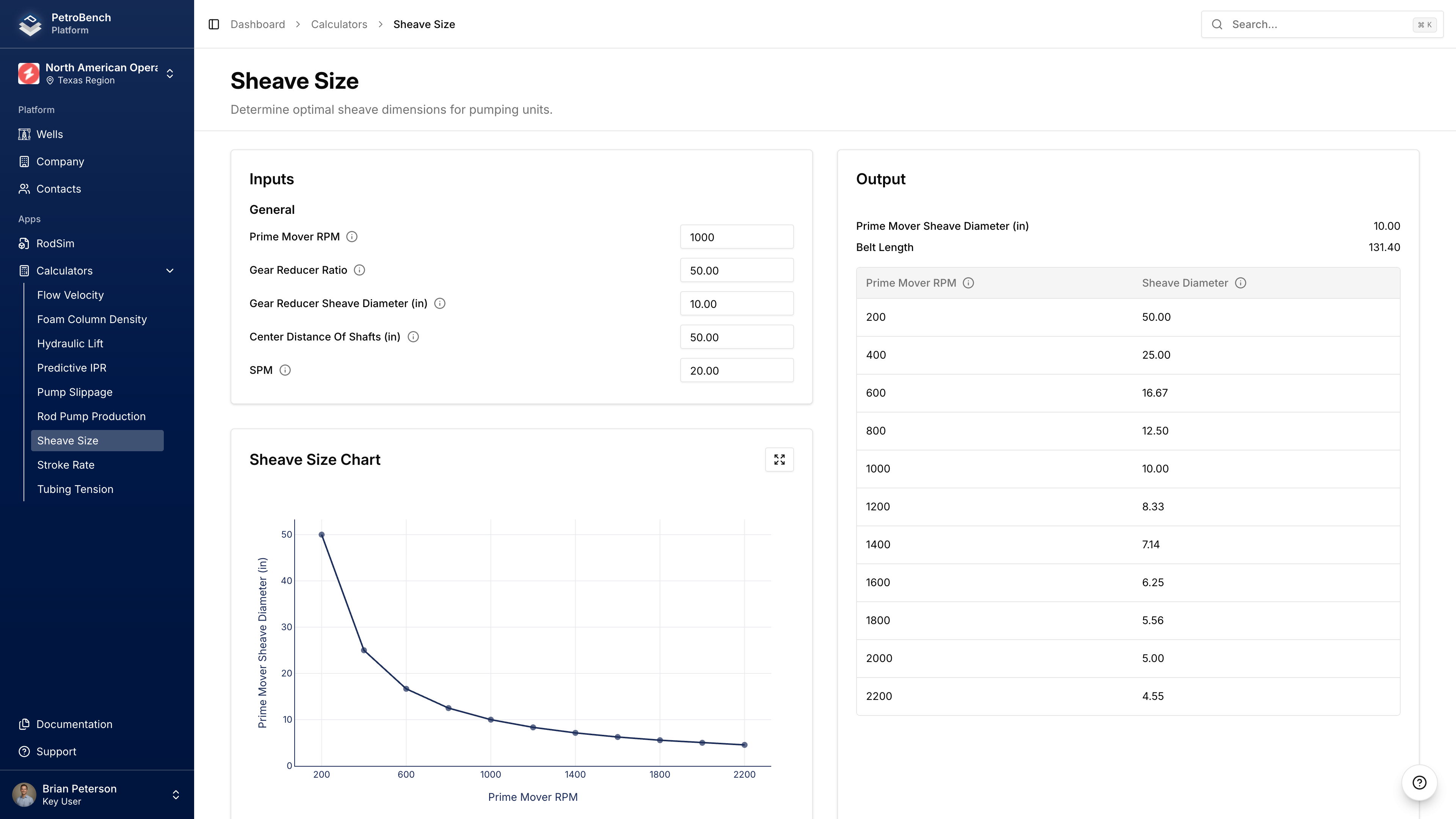 The Sheave Size calculator determines the required prime mover sheave diameter to achieve a target SPM, and calculates the corresponding belt length.