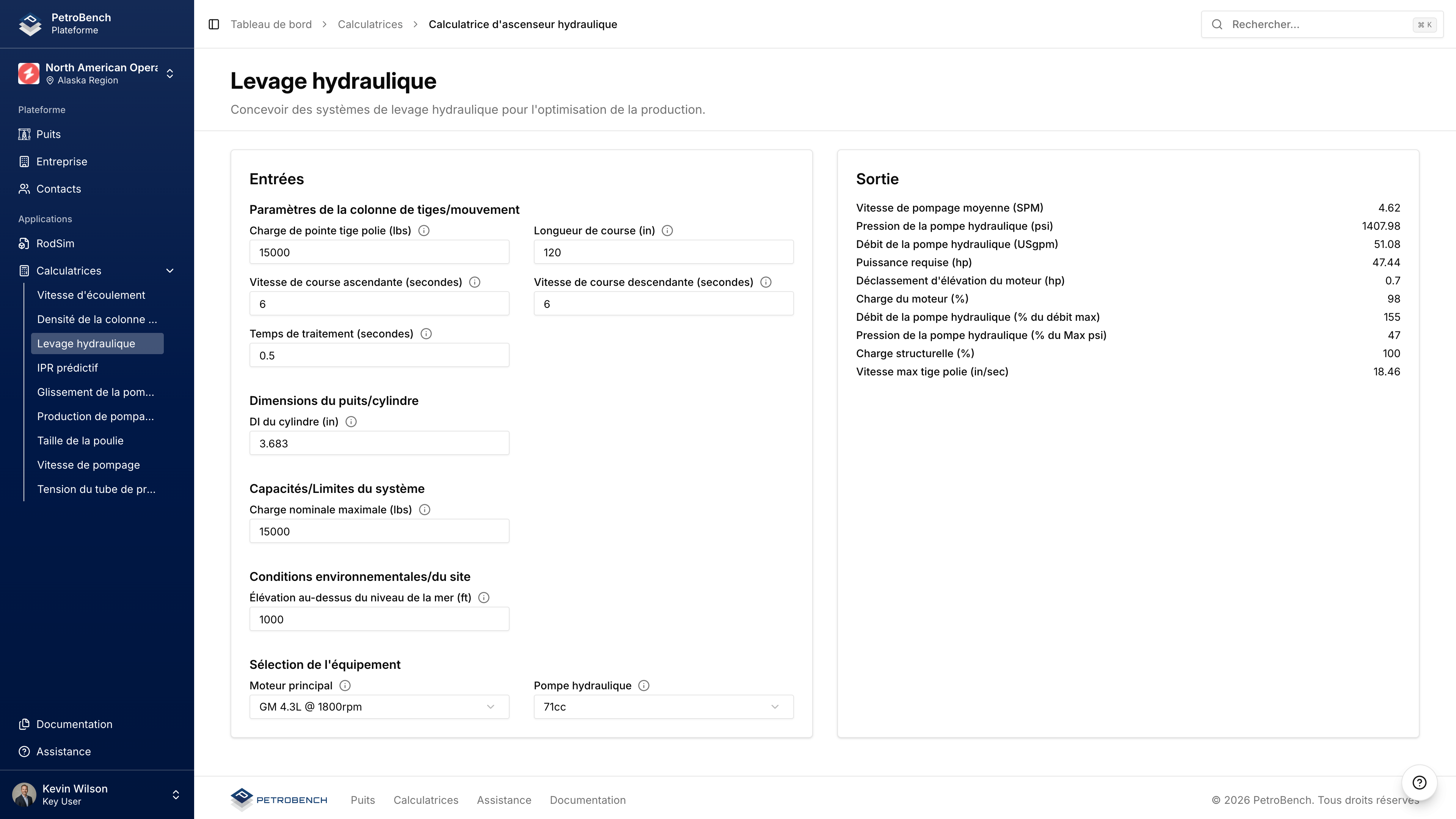 Le calculateur de Levage Hydraulique concoit des systemes de pompage hydraulique en calculant la vitesse de pompe, la pression, les debits et les exigences de puissance.