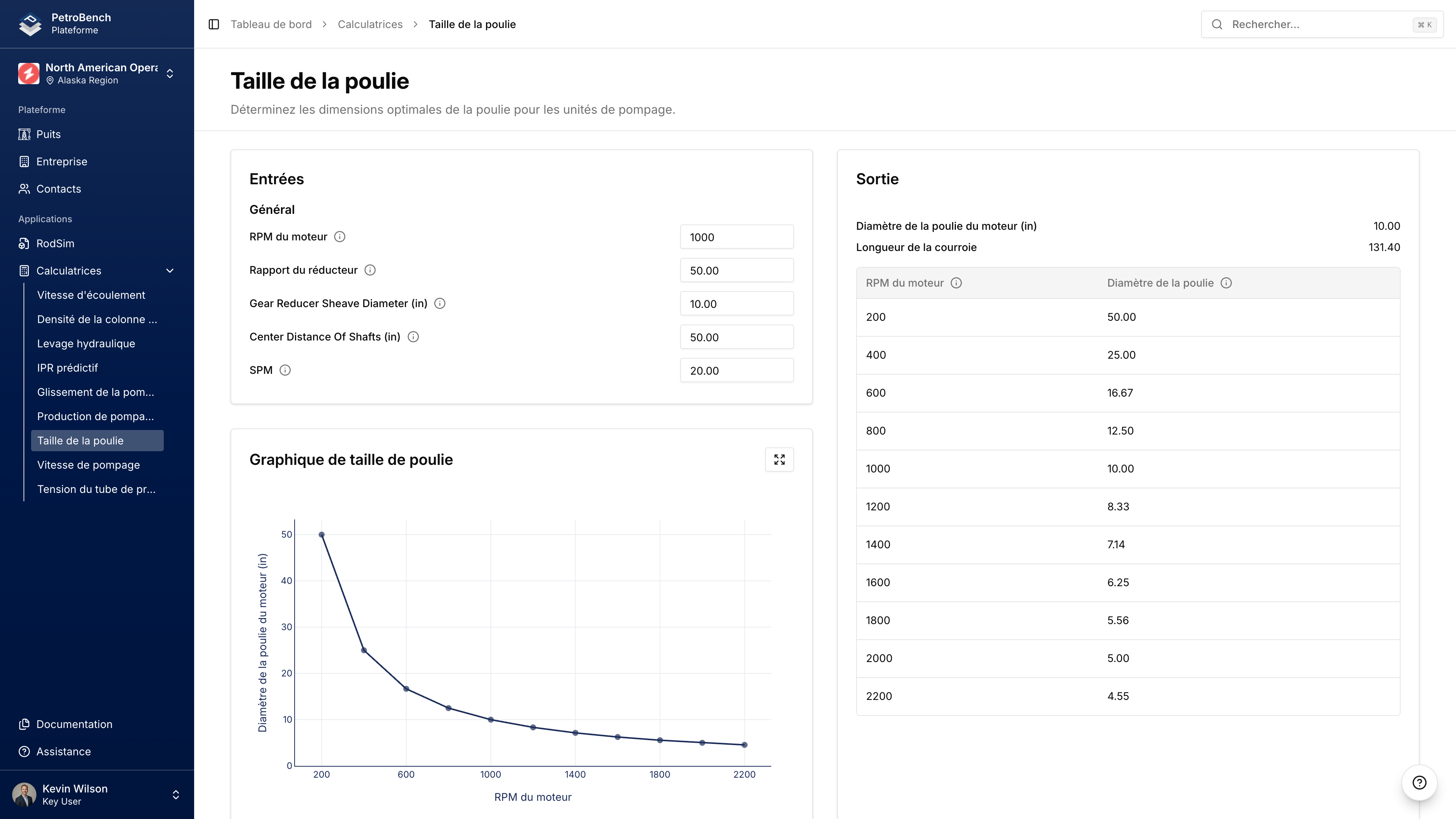 Le calculateur de Taille de Poulie determine le diametre de poulie du moteur principal requis pour atteindre un SPM cible, et calcule la longueur de courroie correspondante.