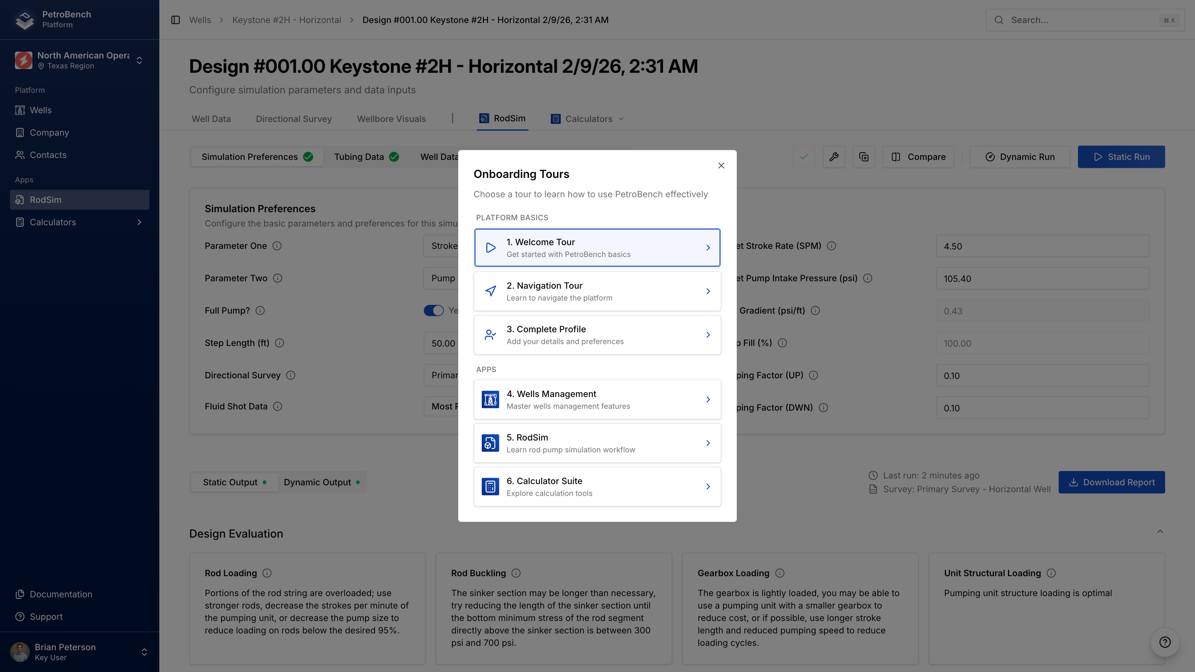 PetroBench includes interactive tours that walk you through key features. Tours highlight UI elements and explain what they do.