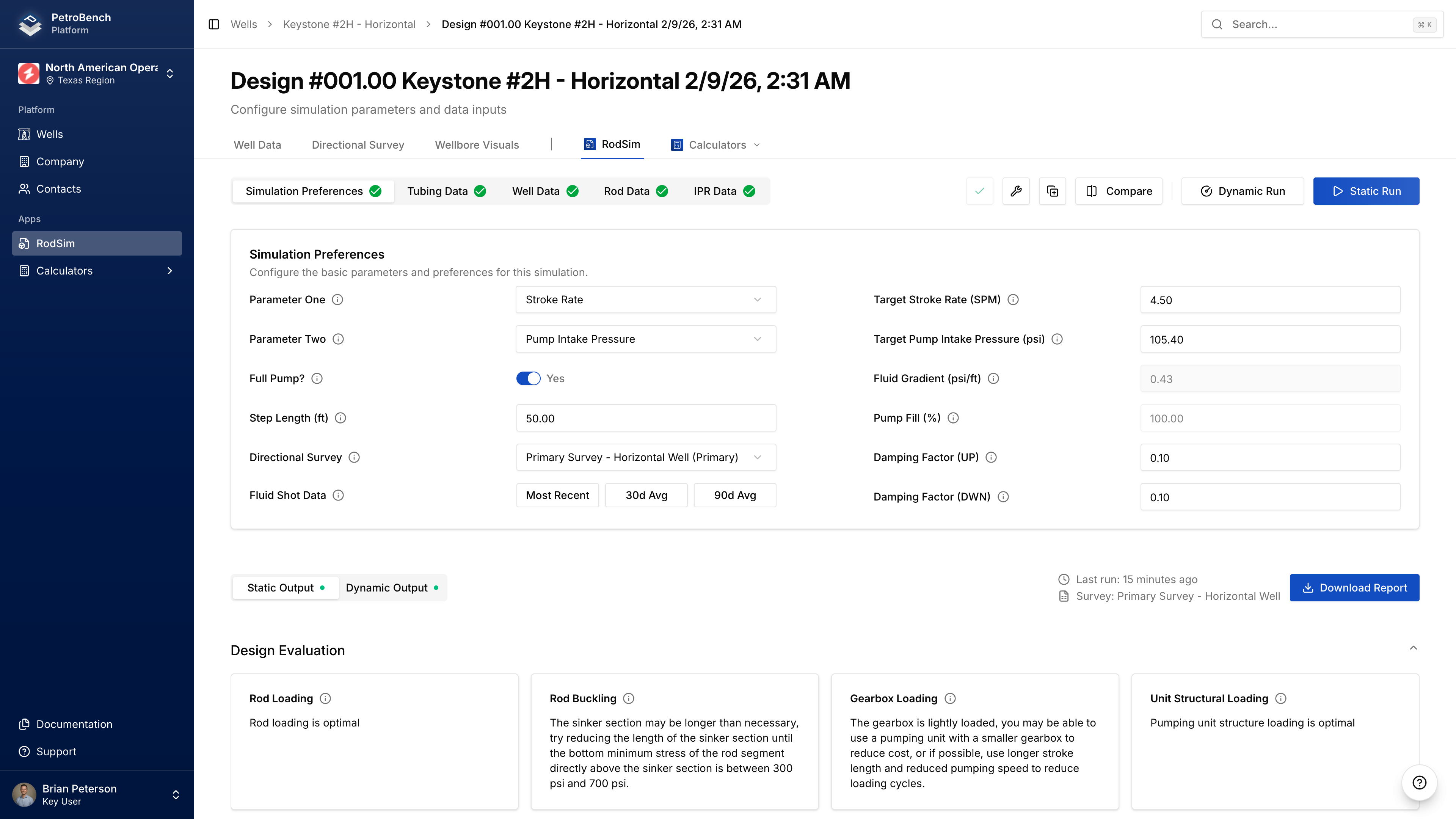 Create a new RodSim rod pump simulation in PetroBench. Select a well, choose equipment, and configure operating parameters to start your analysis.